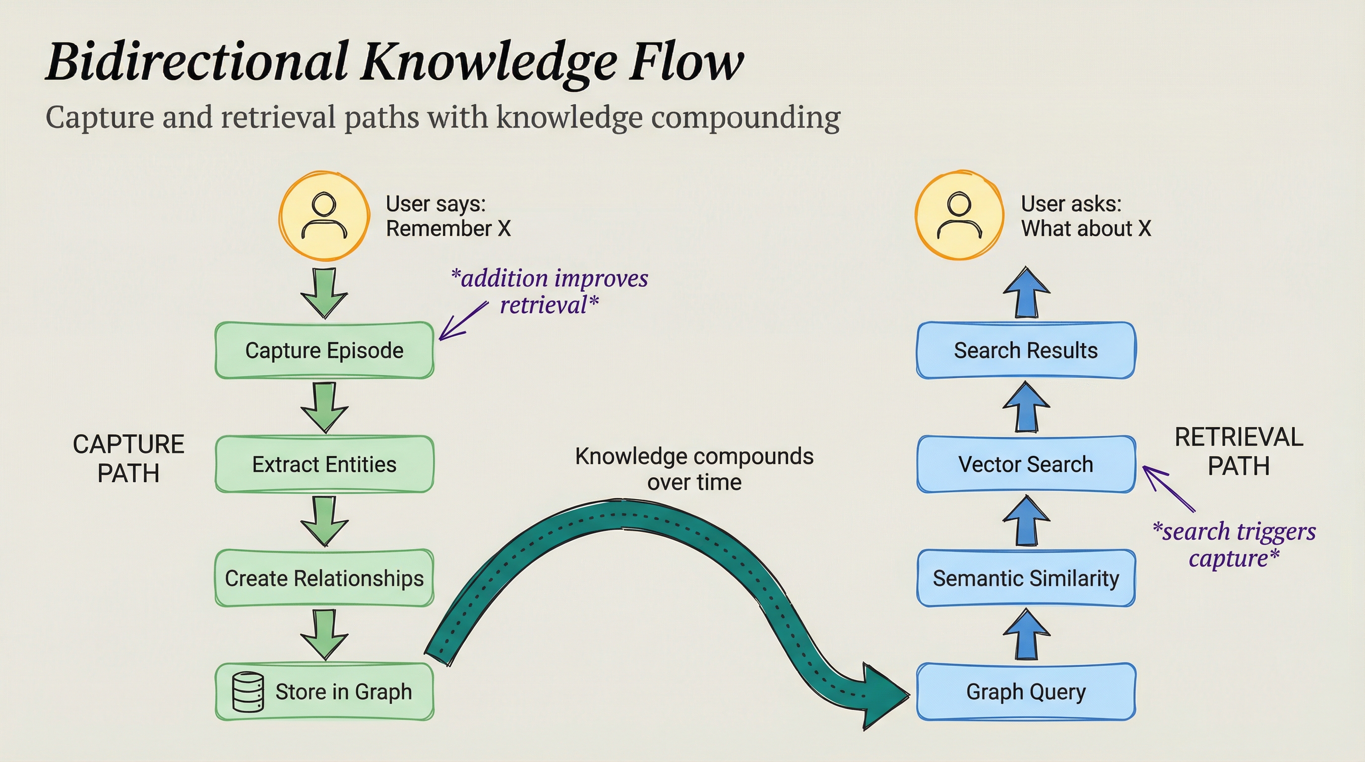 Capture path (green): User says "Remember X" → Capture Episode → Extract Entities → Create Relationships → Store in Graph