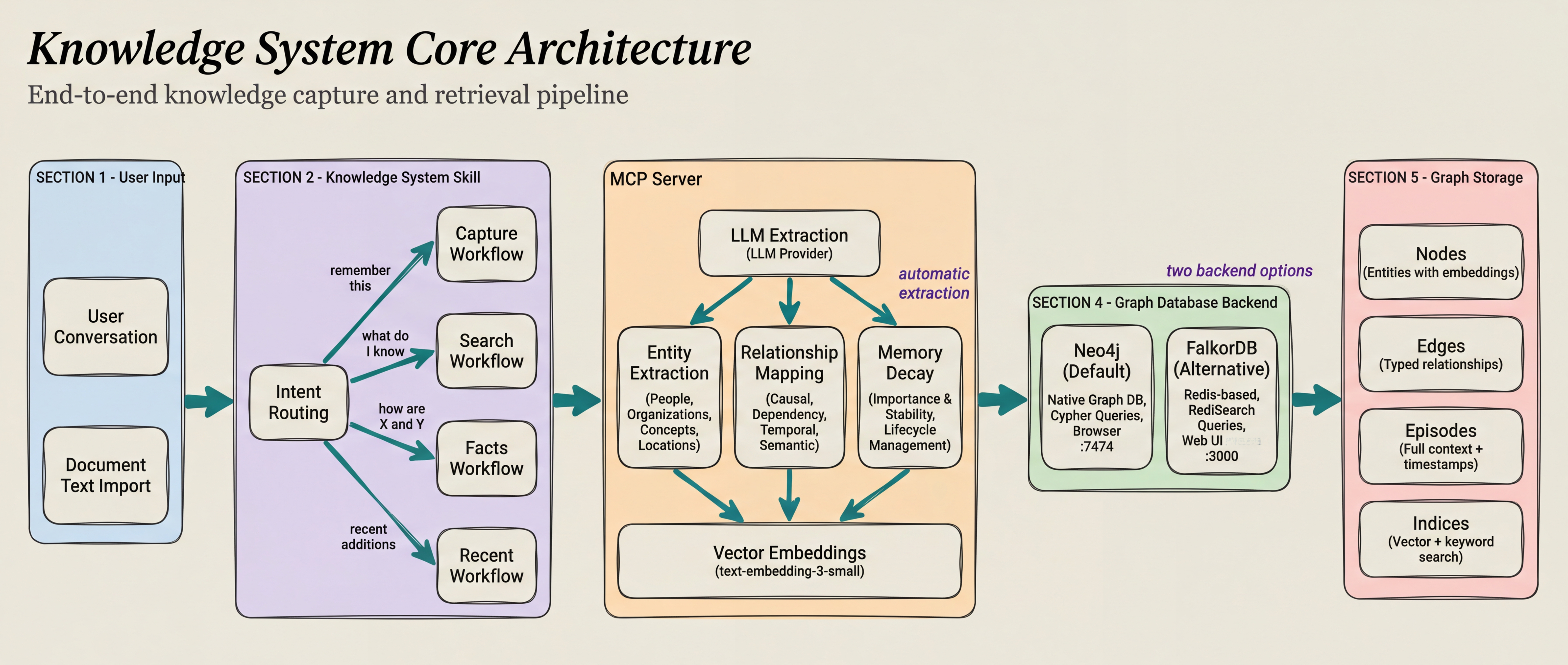 User conversation and document text flow through the Knowledge System Skill → Intent Routing → Graphiti MCP Server (with Memory Decay) → Graph Database Backend (Neo4j/FalkorDB) → Graph Storage (Nodes, Edges, Episodes, Indices)