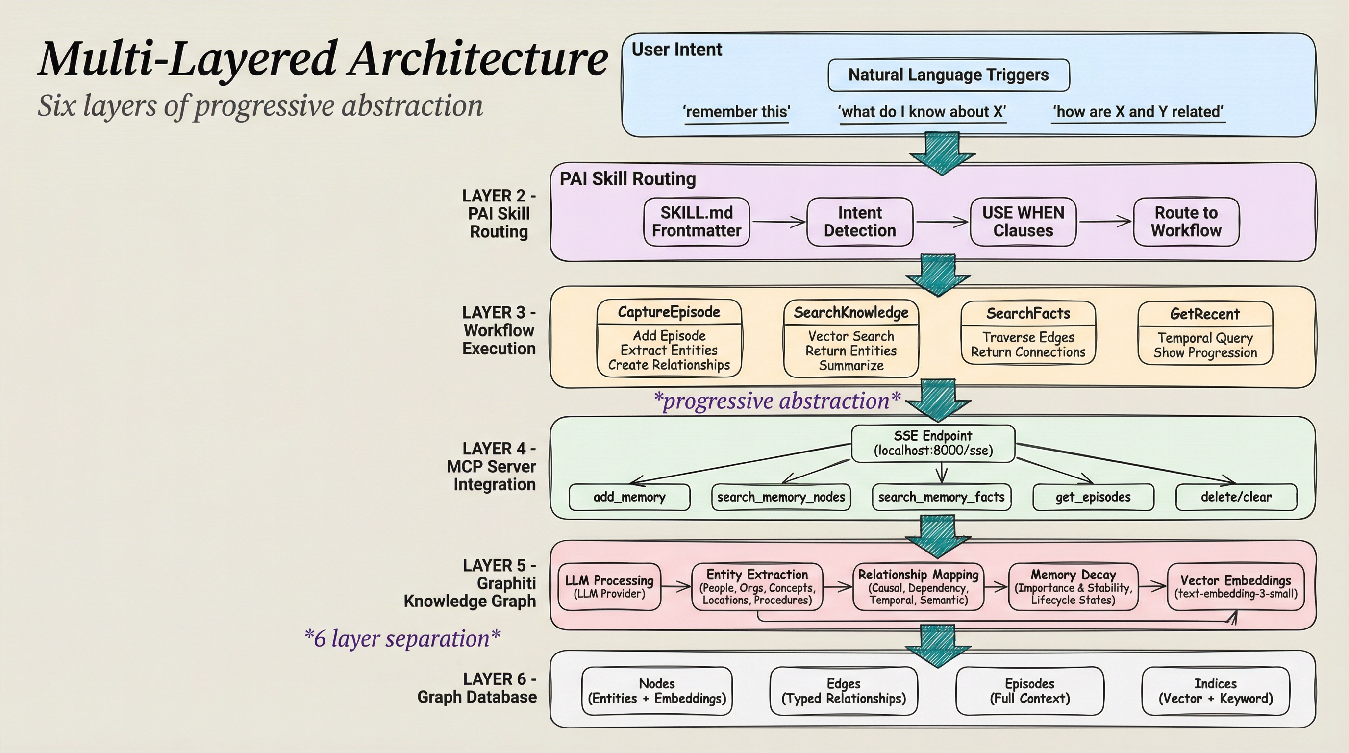 Layer 5 - Graphiti Knowledge Graph: LLM Processing → Entity Extraction → Relationship Mapping → Memory Decay → Vector Embeddings