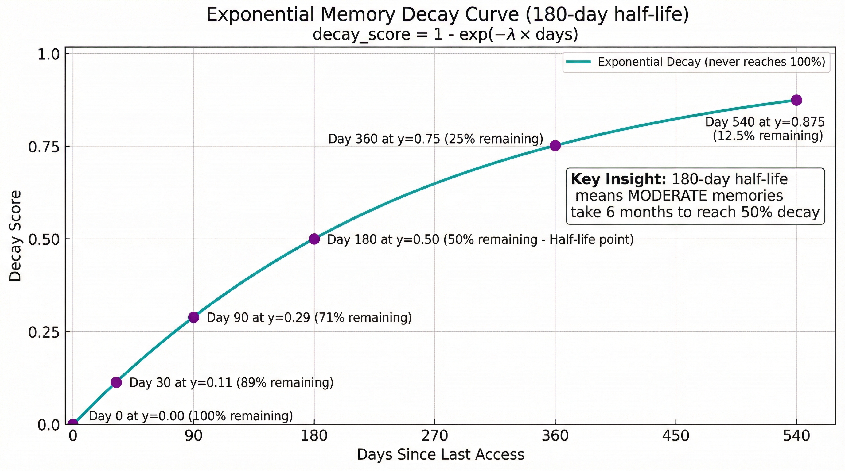 Exponential decay (our implementation): - Day 0: 0% decay - Day 30: 11% decay - Day 90: 29% decay - Day 180: 50% decay (half-life) - Day 360: 75% decay - Day 540: 87.5% decay - Never truly reaches 100%