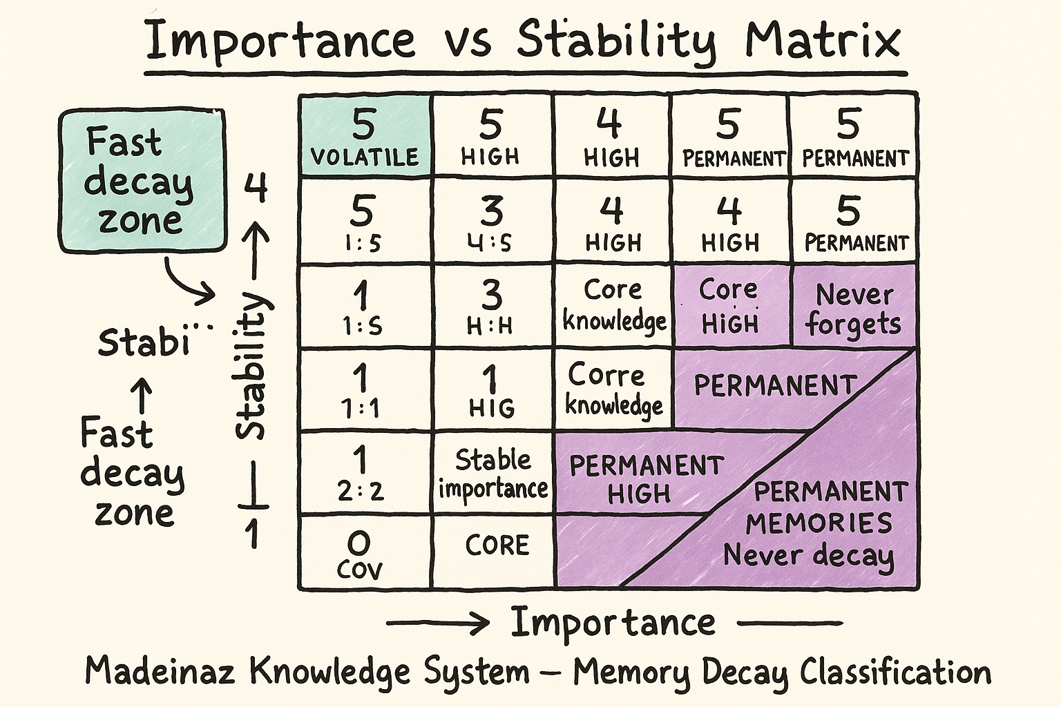 The Madeinoz Knowledge System includes an intelligent memory decay and lifecycle management system (Feature 009) that automatically prioritizes important memories, allows stale information to fade, and maintains sustainable graph growth over time.