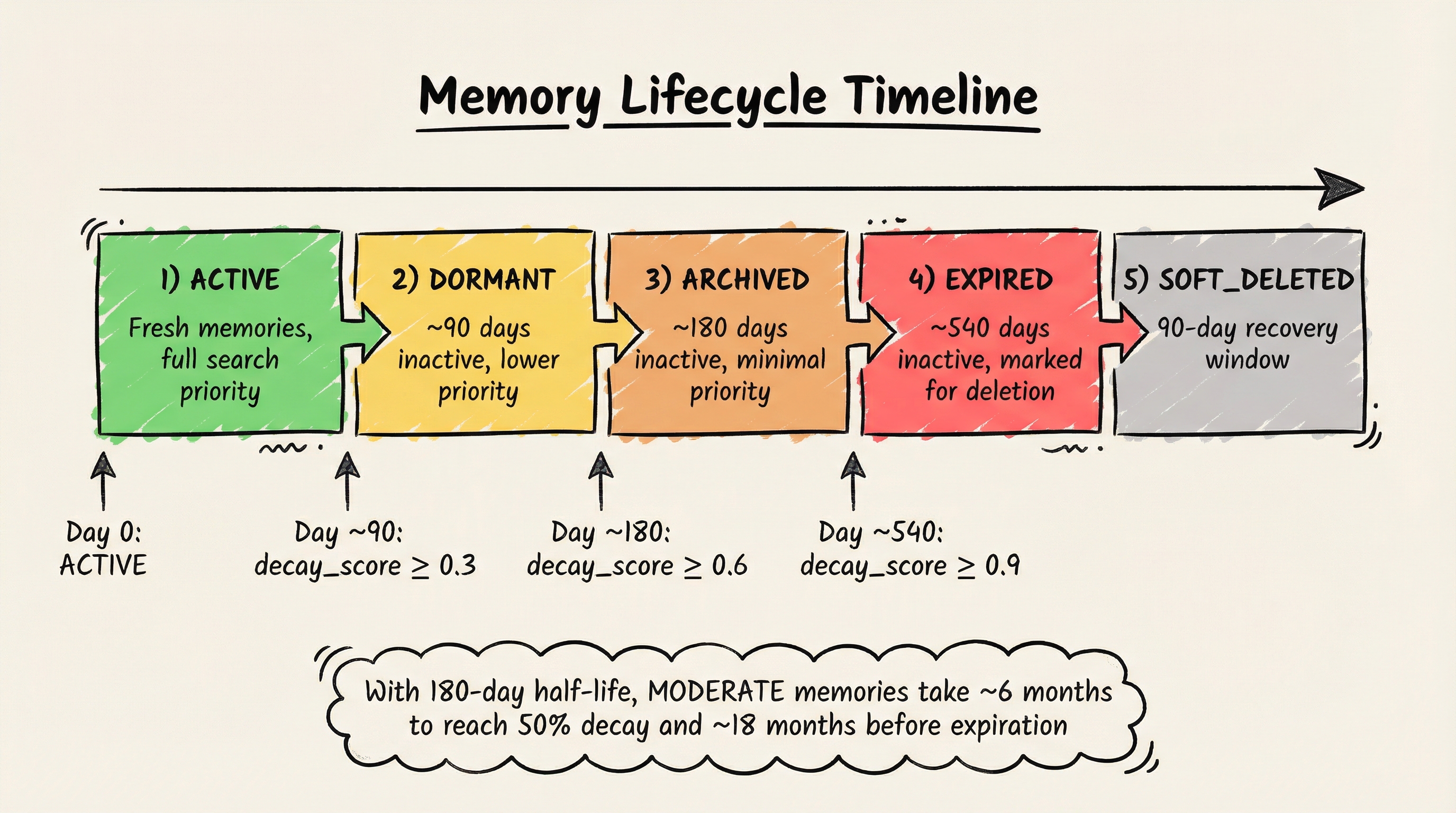 Memories transition through 5 lifecycle states based on decay score and time inactive: