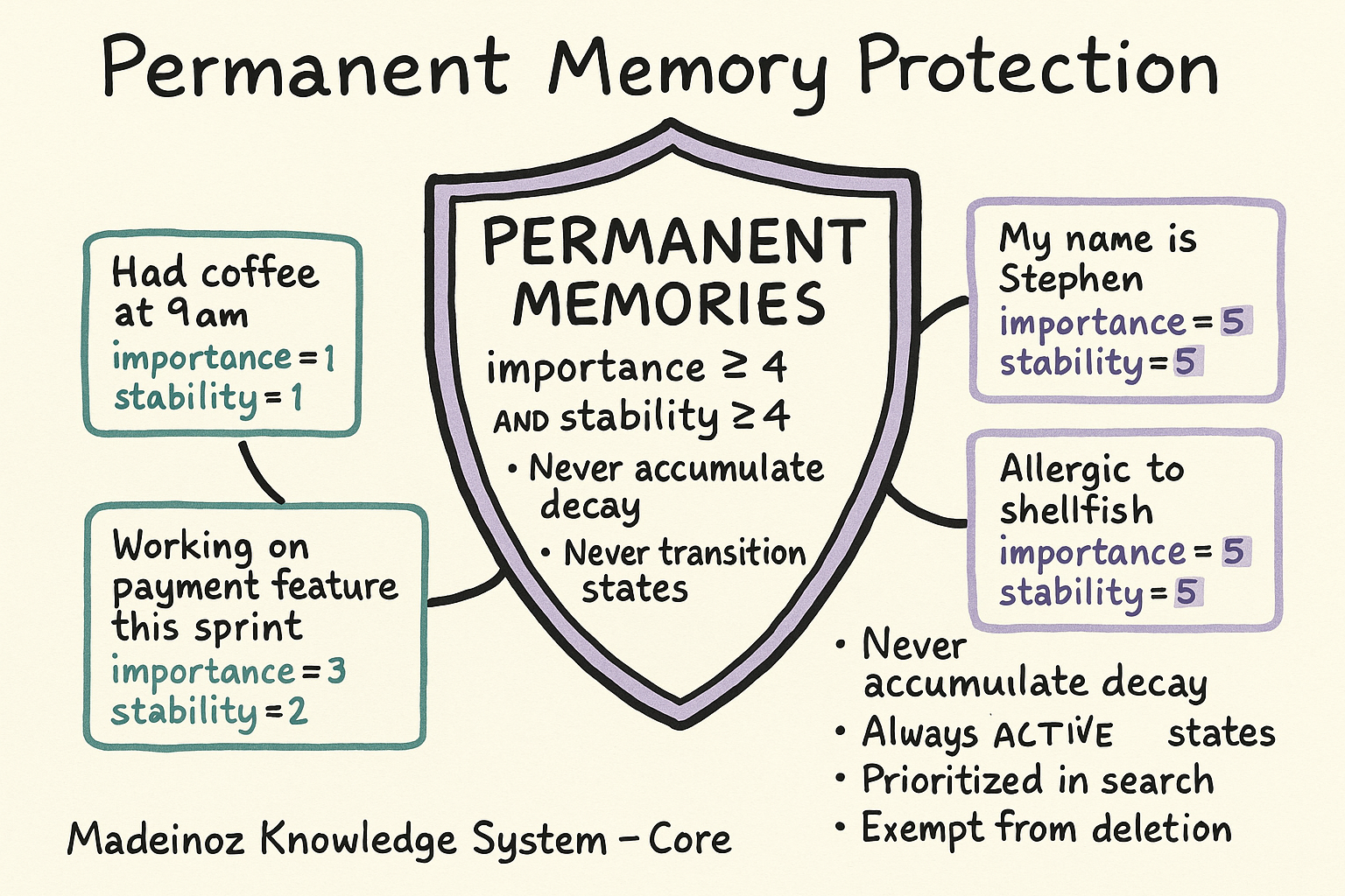 Permanent memories exempt: Importance ≥4 AND Stability ≥4 = PERMANENT (never decays)