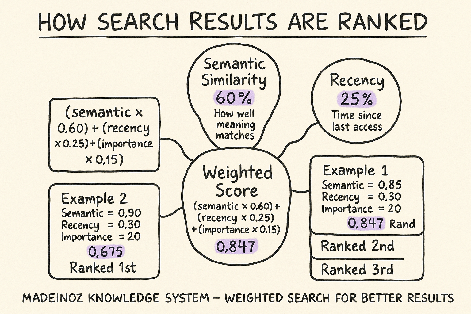 Even though "Today's weather" has the highest semantic similarity (0.95), the "Project architecture" memory ranks first because it combines good semantic match with high importance and reasonable recency.