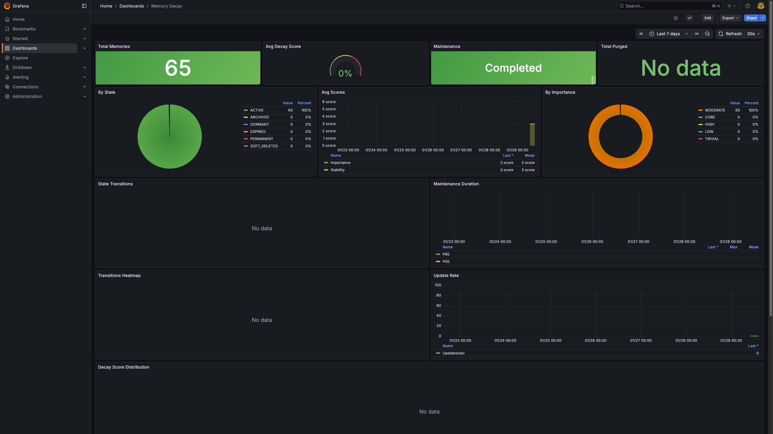 After logging in, navigate to Dashboards in the left sidebar. You'll find the Madeinoz Knowledge System dashboard pre-configured.